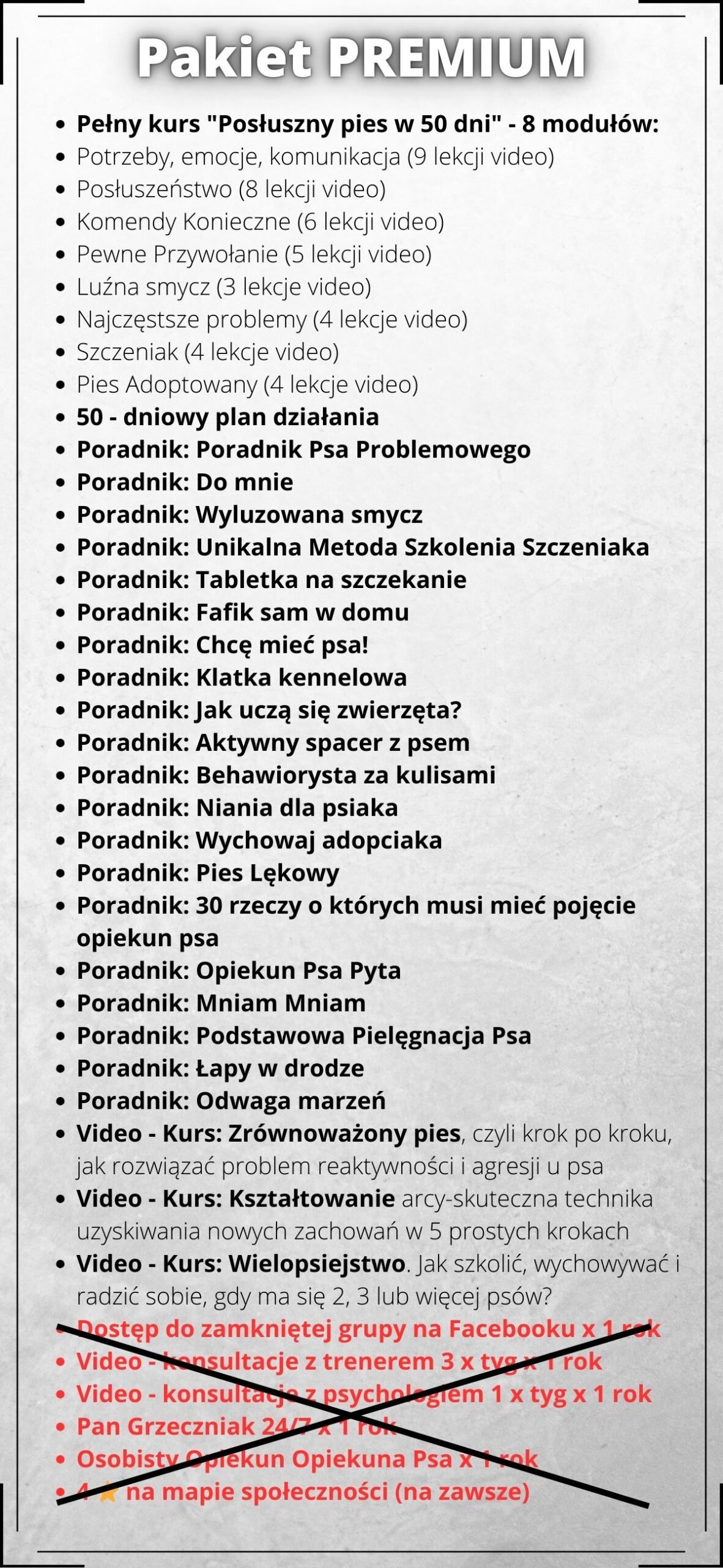 Długość kursu obliczyłem na około 50 dni - tyle powinno zająć Ci przerobienie materiałów. Jeżeli będziesz konsekwentnie pracował/ła ze swoim psem według planu, po 50 dniach powinieneś/powinnaś już mieć diametralnie zmienionego psa na lepsze. Jednak pamiętaj, że każdy pies jest trochę inny i potrzebuje innego tempa. To również od Ciebie zależy, jak szybko przerobisz kurs. Nikt Cię nie goni - masz pięcioletni dostęp do platformy z kursem.